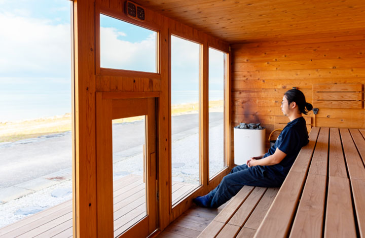 富山湾が一望のオーシャンビュー・サウナは、隆雄さんこだわりの空間
