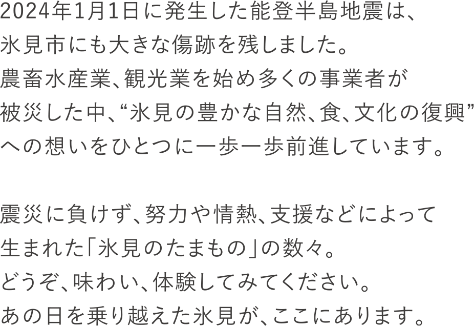「氷見のたまもの」は、能登半島地震で被災した氷見の復興支援を目的として「富山もよう」プロジェクトと、氷見の生産事業者の皆さんとの共同で生まれた氷見の里山・里海・体験の魅力が詰まった賜物(たまもの)を発信するプロジェクトです。